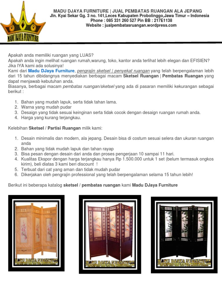 Harga folding door pembatas ruangan pvc full bahan plastik pintu lipat pvc /. Dengan adanya sketsel maka ruangan anda akan terlihat lebih indah dan mewah. Kami juga menjual sketsel minimalis untuk ruangan rumah anda yang bertipe minimalis atau bagi anda yang ingin ruangan rumahnya nampak lebih tertata namun tidak terkesan tambah sempit. Pembatas masjid dari kayu / bambu. Kami telah pengalaman dalam pengiriman ke seluruh daerah di indonesia seperti;