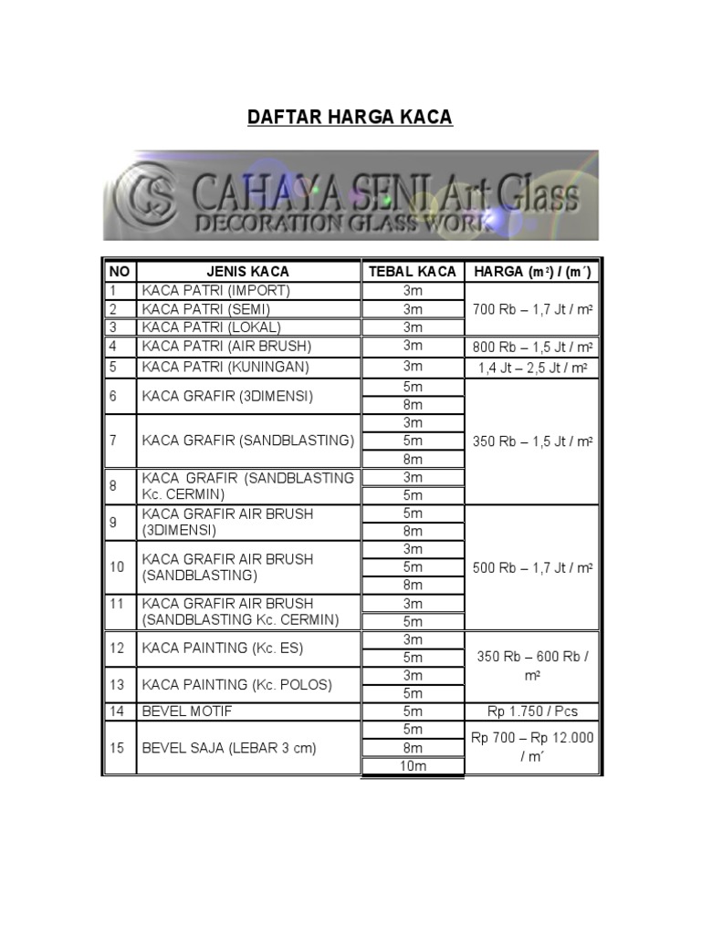 Jenis kaca yang pertama adalah kaca tempered. Tabel berat kaca per m2. Banyak yang memilih acrylic sebagai bahan kaca untuk menghindari hal yang tidak diinginka. Disarankan jika dimensi kaca semakin besar sebaiknya menggunakan kaca yang berukuran tebal juga. Harga tersebut di tingkat distributor berada dikisaran 50 ribuan rupiah sampai dengan 300 ribuan.